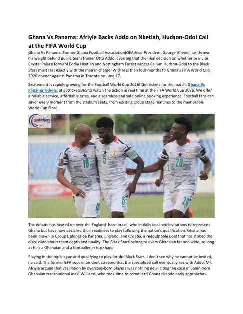 Ghana Vs Panama Tickets: Former Ghana Football Association(GFA)Vice-President, George Afriyie, has thrown his weight behind public team trainer Otto Addo, averring that the final decision on whether to invite Crystal Palace forward Eddie Nketiah and Nottingham Forest winger Callum Hudson-Odoi to the Black Stars must rest exactly with the man in charge. With less than four months to Ghana’s FIFA World Cup 2026 opener against Panama in Toronto on June 17.
