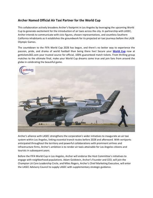 Archer Named Official Air Taxi Partner for the World Cup – Free PDF Download – 5 Pages – Year: 2025 – sports – Read Online @ PDF Room