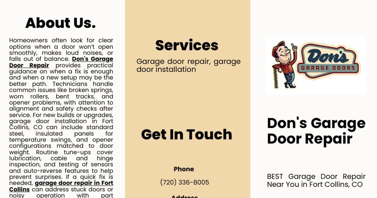 Don’s Garage Door Repair is a trusted garage door company serving homeowners and businesses in Fort Collins, CO. Our experienced team provides reliable garage door repair, installation, and maintenance services to keep your door operating safely and smoothly. From broken springs and cables to opener repairs and full door replacements, we deliver fast, professional solutions tailored to your needs.
