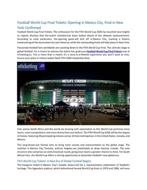 Passionate football fans worldwide are counting down to the FIFA World Cup Final. The ultimate stage in global football. For a chance to witness the action live, grab your Football World Cup Final Tickets now at eTicketing.co. This is more than a match; it’s a once-in-a-lifetime experience you won’t want to miss. Secure your place in history today! Book FIFA 2026 Hospitality Now.