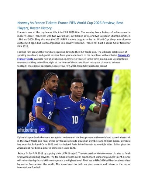 Football fans around the world are counting down to the FIFA World Cup, the ultimate celebration of sporting excellence and global passion. Take your experience to the next level with exclusive Norway Vs France Tickets available now at eTicketing.co. Immerse yourself in the thrill, drama, and unforgettable moments as they unfold live, right at the heart of the action. Don’t miss your chance to witness football’s most iconic spectacle. Secure your FIFA 2026 Hospitality packages today!