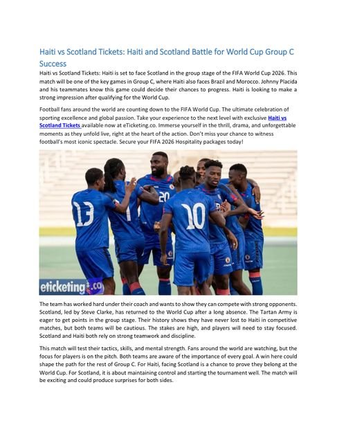 Football fans around the world are counting down to the FIFA World Cup. The ultimate celebration of sporting excellence and global passion. Take your experience to the next level with exclusive Haiti vs Scotland Tickets available now at eTicketing.co. Immerse yourself in the thrill, drama, and unforgettable moments as they unfold live, right at the heart of the action. Don’t miss your chance to witness football’s most iconic spectacle. Secure your FIFA 2026 Hospitality packages today!