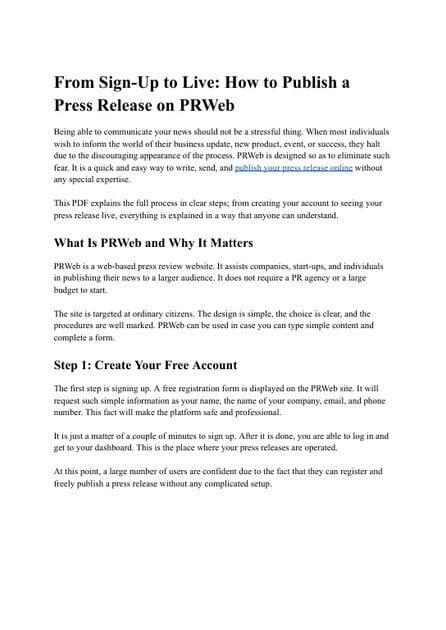 This PDF explains the simple step-by-step process of publishing a press release on PRWeb. It covers everything from creating an account to writing, submitting, and publishing a press release successfully. The guide is written in easy English so that beginners, small businesses, and individuals can follow it without confusion.It also explains how the PRWeb dashboard works, how the editorial review helps improve content quality, and how a press release goes live after approval. Overall, the PDF shows how PRWeb makes it easy to register for free to publish a press release and share news online in a smooth and stress-free way.