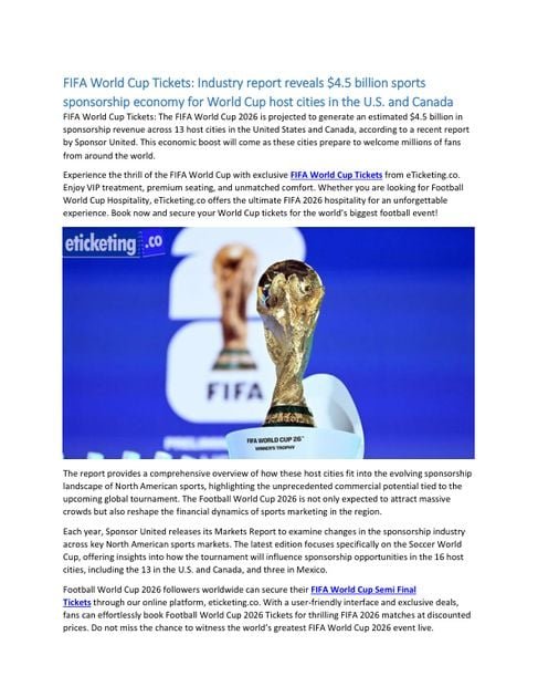 The report provides a comprehensive overview of how these host cities fit into the evolving sponsorship landscape of North American sports, highlighting the unprecedented commercial potential tied to the upcoming global tournament. The Football World Cup 2026 is not only expected to attract massive crowds but also reshape the financial dynamics of sports marketing in the region.Each year, Sponsor United releases its Markets Report to examine changes in the sponsorship industry across key North American sports markets. The latest edition focuses specifically on the Soccer World Cup, offering insights into how the tournament will influence sponsorship opportunities in the 16 host cities, including the 13 in the U.S. and Canada, and three in Mexico.Football World Cup 2026 followers worldwide can secure their FIFA World Cup Semi Final Tickets through our online platform, eticketing.co. With a user-friendly interface and exclusive deals, fans can effortlessly book Football World Cup 2026 Tickets for thrilling FIFA 2026 matches at discounted prices. Do not miss the chance to witness the world’s greatest FIFA World Cup 2026 event live. Football World Cup 2026 Tickets: Sparks Record Sponsorship Growth across North AmericaThe report emphasizes that these host cities already play a vital role in North America’s sports sponsorship ecosystem. They collectively represent nearly half of all team sports sponsorship revenue on the continent, valued at just over $9 billion. With the FIFA World Cup 2026 approaching, these cities are expected to experience even greater sponsorship.At Xchangetickets, football fans can securely buy or sell Football World Cup Tickets with ease, whether it’s Soccer World Cup Tickets, FIFA 2026 Tickets, or the highly sought-after FIFA World Cup Final Tickets. Our platform connects you with genuine fans worldwide, offering a wide range of options, Football World Cup 2026 Tickets, and general Football World Cup Tickets. With our safe and reliable marketplace, you can list your tickets for sale or grab your dream seats at the click of a button, making it simple to experience the thrill of live football from the exciting group stage clashes to the grand finale.