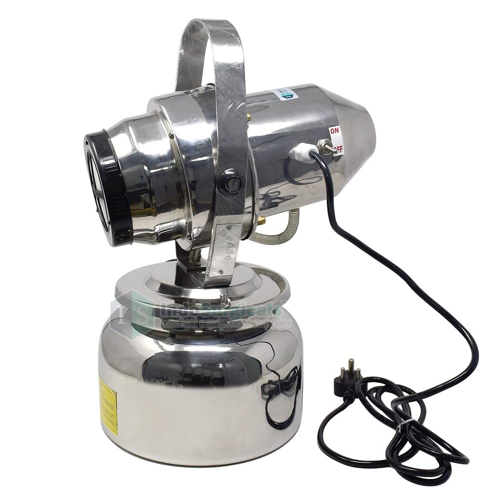 Stainless Steel body to ensure portability & resist chemical attack, Highest area coverage as compared to any other conventional fogger in its category. The unit has a vertical adjustable head and can be rotated horizontally to gain better direction, maximum results and greater efficiency. Compact design and low weight utilizes very little space and the unit can be installed without making any structural changes or modifications. The unit comes pre-fitted with a liquid flow control valve for ease of use. Fog output is controlled with this valve. Higher the volume of output, larger will be the fog particles and vice versa, Tank Capacity Approx. : 5 Liter of chemical storage. Supplied with 60 Minutes Timer