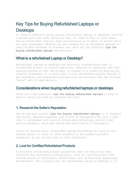 This PDF provides a complete 2025 guide to buying refurbished laptops and desktops with confidence. It explains how to check hardware quality, select the right processor and RAM, ensure SSD upgrades, verify genuine Windows licenses, compare ideal configurations, and avoid common buying mistakes.