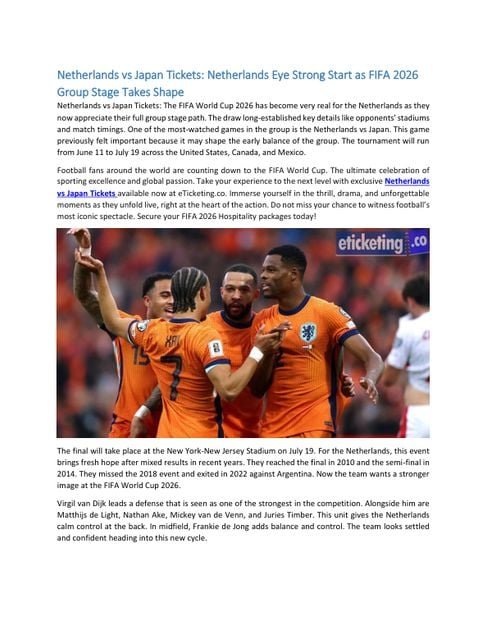 Football fans around the world are counting down to the FIFA World Cup. The ultimate celebration of sporting excellence and global passion. Take your experience to the next level with exclusive Netherlands vs Japan Tickets available now at eTicketing.co. Immerse yourself in the thrill, drama, and unforgettable moments as they unfold live, right at the heart of the action. Don’t miss your chance to witness football’s most iconic spectacle. Secure your FIFA 2026 Hospitality packages today!