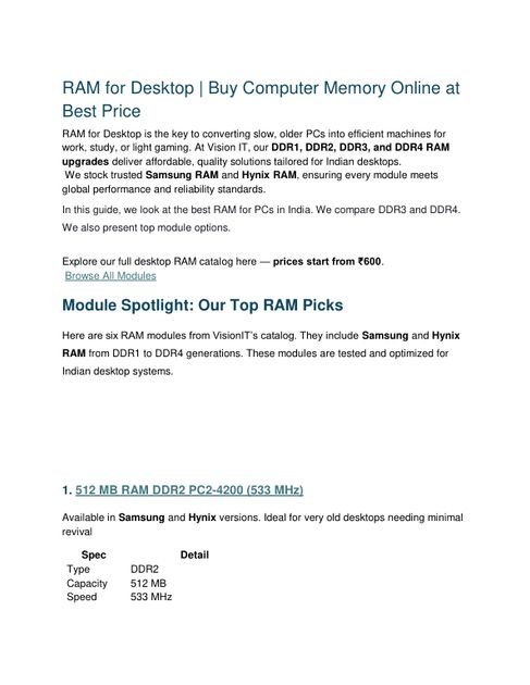 Upgrading your desktop’s RAM is the simplest way to transform slow systems into smooth, reliable performers. At Vision IT Peripherals, you’ll find high-quality Samsung and Hynix RAM ranging from DDR1 to DDR4, perfectly suited for Indian desktops. From budget-friendly 512MB DDR2 modules to high-performance 16GB DDR3 memory, every unit is tested for speed and reliability. Understanding DDR3 vs DDR4 helps users choose the right module — DDR3 for legacy systems, DDR4 for modern PCs. Whether for office tasks, study, or light gaming, upgrading RAM boosts speed, multitasking, and lifespan. As a Microsoft Authorized Refurbisher, Vision IT ensures genuine, warranty-backed products with nationwide delivery. Starting at just ₹600, our RAM upgrades offer the best blend of performance, value, and trust for every desktop.Â