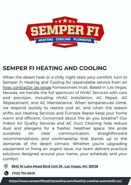 When the desert heat or a chilly night tests your comfort, turn to Semper Fi Heating and Cooling for dependable service from an hvac contractor las vegas homeowners trust. Based in Las Vegas, Nevada, we handle the full spectrum of HVAC Services with care and precision, including HVAC Installation, AC Repair, AC Replacement, and AC Maintenance. When temperatures climb, we respond quickly to restore cool air, and when the season shifts, our Heating Services and Furnace Repair keep your home warm and efficient. Concerned about the air you breathe? Our Indoor Air Quality Services and AC Duct Cleaning help reduce dust and allergens for a fresher, healthier space. We pride ourselves on clear communication, straightforward recommendations, and workmanship that stands up to the demands of the desert climate. Whether you’re upgrading equipment or fixing an urgent issue, our team delivers practical solutions designed around your home, your schedule, and your comfort.