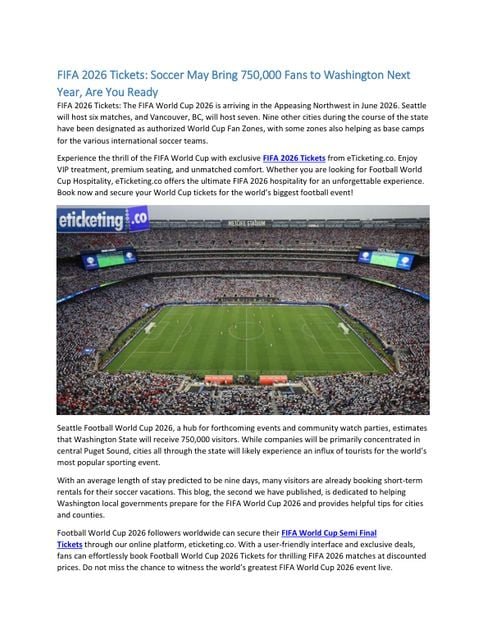 FIFA 2026 Tickets: The FIFA World Cup 2026 is arriving in the Appeasing Northwest in June 2026. Seattle will host six matches, and Vancouver, BC, will host seven. Nine other cities during the course of the state have been designated as authorized World Cup Fan Zones. With some zones also helping as base camps for the various international soccer teams. Experience the thrill of the FIFA World Cup with exclusive FIFA 2026 Tickets from eTicketing.co. Enjoy VIP treatment, premium seating, and unmatched comfort. Whether you are looking for Football World Cup Hospitality, eTicketing.co offers the ultimate FIFA 2026 hospitality for an unforgettable experience. Book now and secure your World Cup tickets for the world’s biggest football event! Football World Cup Tickets| FIFA 2026 Tickets | FIFA World Cup 2026 Tickets Seattle Football World Cup 2026, a hub for forthcoming events and community watch parties. Estimates that Washington State will receive 750,000 visitors. While companies will be primarily concentrated in central Puget Sound. Cities all through the state will likely experience an influx of tourists for the world’s most popular sporting event. With an average length of stay predicted to be nine days. Many visitors are already booking short-term rentals for their soccer vacations. Our second publication helps Washington’s local governments prepare for the FIFA World Cup 2026. And provides helpful tips for cities and counties. Football World Cup 2026 followers worldwide can secure their FIFA World Cup Semi Final Tickets through our online platform, eticketing.co. With a user-friendly interface and exclusive deals, fans can effortlessly book Football World Cup 2026 Tickets for thrilling FIFA 2026 matches at discounted prices. Do not miss the chance to witness the world’s greatest FIFA World Cup 2026 event live. Football World Cup 2026 Tickets: Seattle Businesses Gear Up for World Cup The Seattle Metro Chamber of Commerce has amalgamated with Seattle FIFA 2026 and King County to provide resources to small businesses on its World Cup Ready website. The partnership predicts the Football World Cup 2026 will generate $929 million in economic benefit in Washington, with $106.5 million in atotal state and local taxes generated. At Xchangetickets, football fans can securely buy or sell FIFA World Cup Tickets with ease, whether it’s Soccer World Cup Tickets, FIFA 2026 Tickets, or the highly sought-after FIFA World Cup Final Tickets. Our platform connects you with genuine fans worldwide, offering a wide range of options, Football World Cup 2026 Tickets, and general Football World Cup Tickets. With our safe and reliable marketplace, you can list your tickets for sale or grab your dream seats at the click of a button, making it simple to experience the thrill of live football from the exciting group stage clashes to the grand finale. FIFA World Cup Tickets| FIFA 2026 Tickets | Football World Cup 2026 Tickets Short-term rental display places and North American-based STR hosts are touching to take advantage of this windfall. Airbnb has crossed the threshold into a global partnership with FIFA to promote the Soccer World Cup and other international soccer tournaments. Football fans around the world are counting down to the FIFA World Cup. The ultimate celebration of sporting excellence and global passion. Take your experience to the next level with exclusive USA FIFA World Cup Tickets, available now at eTicketing.co. Immerse yourself in the thrill, drama, and unforgettable moments as they unfold live, right at the heart of the action. Don’t miss your chance to witness football’s most iconic spectacle. Secure your FIFA 2026 Hospitality packages today! World Cup Tickets: Kansas City and Seattle Relax STR Rules Ahead of FIFA World Cup 2026 Boom With its hosts poised to earn up to $210 million. It is initiating a $5 million Host City Impact Program to support initiatives that benefit local societies. Companies that support STR hosts, such as Turno, have also published guides for hosts to boost options during the big event. A new STR platform now focuses on housing for soccer travelers. Passionate football fans worldwide are counting down to the FIFA World Cup Final. The ultimate stage in global football. For a chance to witness the action live, grab your FIFA World Cup Final Tickets now at eTicketing.co. This is more than a match; it’s a once-in-a-lifetime experience you won’t want to miss. Secure your place in history today! Book FIFA 2026 Hospitality Now. Meanwhile, the Kansas City Short-Term Rental Alliance is accommodating a World Cup Hosting Crash Course to encourage property owners to create STRs to meet the demand in that host city. Organizers scheduled the final tournament draw for December 2025. At that time, STR bookings will likely increase dramatically. Click to read more on FIFA World Cup 2026. FIFA 2026 Tickets: World Cup Set to Transform Seattle’s Economy and Tourism As soccer fans know, which location will be hosting their home squads and which will be hosting team matches? There are a number of lines of attack that Washington cities, towns, and counties may want to consider. In the metro area of Kansas City, most jurisdictions are not development changes to their STR regulations or bans. World Cup Tickets | FIFA 2026 Tickets | FIFA World Cup Final Tickets However, cities such as Parkville, Missouri, are, for the time being, relaxing STR regulations in 2026 to take advantage of the proximity to Kansas City and the prospective economic benefit this may bring. STR operators will still need to obtain a certification, but limitations on the total number of STRs will be lifted. MRSC has identified 21 Washington local administrations that have adopted STR ordinances since MRSC last published a blog about STRs in 2021. Most included procedures aimed at balancing the economic opportunities of STRs with upholding a healthy supply of long-term rental housing and ensuring public he