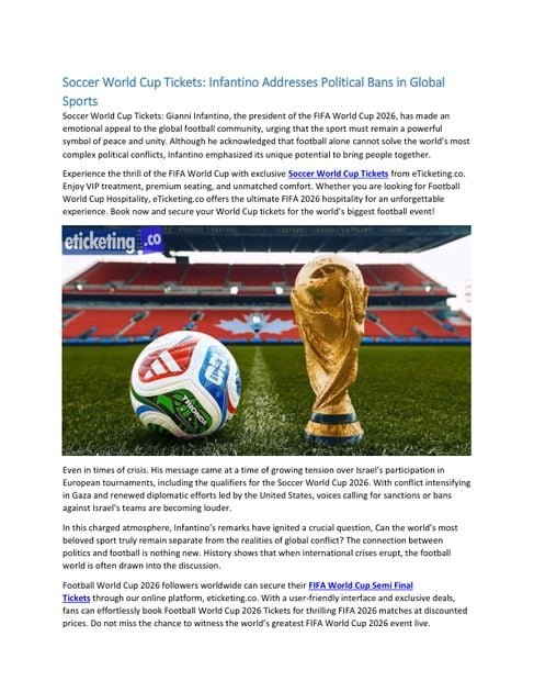 Soccer World Cup Tickets: Gianni Infantino, the president of the FIFA World Cup 2026, has made an emotional appeal to the global football community. Urging that the sport must remain a powerful symbol of peace and unity. Although he acknowledged that football alone cannot solve the world’s most complex political conflicts. Infantino emphasized its unique potential to bring people together. Experience the thrill of the FIFA World Cup with exclusive Soccer World Cup Tickets from eTicketing.co. Enjoy VIP treatment, premium seating, and unmatched comfort. Whether you are looking for Football World Cup Hospitality, eTicketing.co offers the ultimate FIFA 2026 hospitality for an unforgettable experience. Book now and secure your World Cup tickets for the world’s biggest football event! Football World Cup Tickets| FIFA 2026 Tickets | FIFA World Cup 2026 Tickets Even in times of crisis. His message came at a time of growing tension over Israel’s participation in European tournaments. Including the qualifiers for the Soccer World Cup 2026. With conflict intensifying in Gaza and renewed diplomatic efforts led by the United States. Voices calling for sanctions or bans against Israel’s teams are becoming louder. In this charged atmosphere, Infantino’s remarks have ignited a crucial question. Can the world’s most beloved sport truly remain separate from the realities of global conflict? The connection between politics and football is nothing new. History shows that when international crises erupt, the football world is often drawn into the discussion. Football World Cup 2026 followers worldwide can secure their FIFA World Cup Semi Final Tickets through our online platform, eticketing.co. With a user-friendly interface and exclusive deals, fans can effortlessly book Football World Cup 2026 Tickets for thrilling FIFA 2026 matches at discounted prices. Do not miss the chance to witness the world’s greatest FIFA World Cup 2026 event live. FIFA 2026 Tickets: A New Era of Unity beyond Political Boundaries A vivid example of this was seen in 2022, when Russia was suspended from both FIFA 2026 and UEFA following its invasion of Ukraine. The decision was monumental, effectively barring Russian national teams and clubs from competing in any official matches or tournaments, including World Cup qualifiers. The suspension extended to other major events. At Xchangetickets, football fans can securely buy or sell Football World Cup Tickets with ease, whether it’s Soccer World Cup Tickets, FIFA 2026 Tickets, or the highly sought-after FIFA World Cup Final Tickets. Our platform connects you with genuine fans worldwide, offering a wide range of options, Football World Cup 2026 Tickets, and general Football World Cup Tickets. With our safe and reliable marketplace, you can list your tickets for sale or grab your dream seats at the click of a button, making it simple to experience the thrill of live football from the exciting group stage clashes to the grand finale. FIFA World Cup Tickets| FIFA 2026 Tickets | Football World Cup 2026 Tickets Such as the 2024 Paris Olympics, where Russian athletes faced restrictions and neutral participation rules. These measures remain in place even today, serving as a striking reminder of how political actions can ripple into the world of sports, disrupting careers, competitions, and fans’ passion alike. The Russian ban demonstrated that football. Football fans around the world are counting down to the FIFA World Cup. The ultimate celebration of sporting excellence and global passion. Take your experience to the next level with exclusive USA FIFA World Cup Tickets, available now at eTicketing.co. Immerse yourself in the thrill, drama, and unforgettable moments as they unfold live, right at the heart of the action. Don’t miss your chance to witness football’s most iconic spectacle. Secure your FIFA 2026 Hospitality packages today! World Cup Tickets: From Conflict to Connection: The Positive Power of FIFA World Cup 2026 No matter how much it strives for neutrality, it cannot completely isolate itself from world affairs. Such instances have sparked widespread debate within the global sporting community. Many fans and analysts question whether imposing sporting sanctions genuinely contributes to peace or merely deepens political divides. Passionate football fans worldwide are counting down to the FIFA World Cup Final. The ultimate stage in global football. For a chance to witness the action live, grab your FIFA World Cup Final Tickets now at eTicketing.co. This is more than a match; it’s a once-in-a-lifetime experience you won’t want to miss. Secure your place in history today! Book FIFA 2026 Hospitality Now. Some argue that excluding nations from international events sends a strong moral message, showing that aggression and human rights violations will not be tolerated. Others, however, believe that such actions punish innocent athletes and fans, undermining the very spirit of unity that sport is supposed to promote. Click to read more on FIFA World Cup 2026. Soccer World Cup Tickets: FIFA 2026, Football’s Role in Promoting Peace and International Friendship This tension between ethics and inclusion continues to test the credibility of major sporting bodies like the Football World Cup 2026 and UEFA. As time passes, the long-term impact of these decisions remains uncertain, leaving the world to ponder whether they truly foster peace or only add another layer of division. Infantino’s recent statements highlight the growing complexity of this dilemma. World Cup Tickets | FIFA 2026 Tickets | FIFA World Cup Final Tickets He recognizes that the mission of sports organizations has evolved beyond organizing tournaments or enforcing rules; they are now navigating sensitive global issues where every decision can have political consequences. Striking a balance between maintaining fair play and responding to geopolitical realities is becoming increasingly di