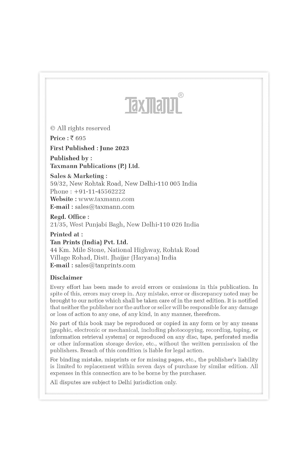 Packer : Taxmann Publications Private Limited, 59/32, New Rohtak Road, New Delhi-110005, Email Id: sales@taxmann.com, Phone Number: 011-45562222