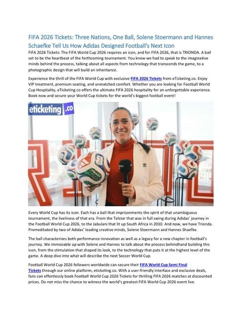 FIFA 2026 Tickets: The FIFA World Cup 2026 requires an icon, and for FIFA 2026, that is TRIONDA. A ball set to be the heartbeat of the forthcoming tournament. You know we had to speak to the imaginative minds behind the process, talking about all aspects from technology that transcends the game, to a photographic design that will build an inheritance. Experience the thrill of the FIFA World Cup with exclusive FIFA 2026 Tickets from eTicketing.co. Enjoy VIP treatment, premium seating, and unmatched comfort. Whether you are looking for Football World Cup Hospitality, eTicketing.co offers the ultimate FIFA 2026 hospitality for an unforgettable experience. Book now and secure your World Cup tickets for the world’s biggest football event! Football World Cup Tickets| FIFA 2026 Tickets | FIFA World Cup 2026 Tickets Every World Cup has its icon. Each has a ball that imprisonments the spirit of that unambiguous tournament, the liveliness of that era. From the Telstar that was in full swing during Adidas’ journey in the Football World Cup 2026, to the Jabulani that lit up South Africa in 2010. And now, we have Trionda. Premeditated by two of Adidas’ leading creative minds, Solene Stoermann and Hannes Shaefke. The ball characterizes both performance innovation as well as a legacy for a new chapter in football’s journey. We immovable up with Solene and Hannes to talk about the process behindhand building this icon, from the stimulation that shaped its look, to the technology that puts it at the highest level of the game. A deep dive into what will describe the next Soccer World Cup. Football World Cup 2026 followers worldwide can secure their FIFA World Cup Semi Final Tickets through our online platform, eticketing.co. With a user-friendly interface and exclusive deals, fans can effortlessly book Football World Cup 2026 Tickets for thrilling FIFA 2026 matches at discounted prices. Do not miss the chance to witness the world’s greatest FIFA World Cup 2026 event live. World Cup Tickets: Trionda Ball Design Inspired by the USA, Canada, and Mexico for FIFA 2026 First up is Solene, who walked with us over and done with the visual aesthetics of the ball, from colors, to graphics to paneling. Let’s start with the motivation. Where did the idea for the Trionda FIFA World Cup 2026 ball design come from? First of all, we wanted to pay reverence to the three host nations, the U.S., Canada, and Mexico. At Xchangetickets, football fans can securely buy or sell FIFA World Cup Tickets with ease, whether it’s Soccer World Cup Tickets, FIFA 2026 Tickets, or the highly sought-after FIFA World Cup Final Tickets. Our platform connects you with genuine fans worldwide, offering a wide range of options, Football World Cup 2026 Tickets, and general Football World Cup Tickets. With our safe and reliable marketplace, you can list your tickets for sale or grab your dream seats at the click of a button, making it simple to experience the thrill of live football from the exciting group stage clashes to the grand finale. World Cup Tickets | FIFA 2026 Tickets | FIFA World Cup Final Tickets It’s the first time in times gone by that three countries have united to host a Football World Cup 2026, and that felt incredibly unique and special to us. We wanted to express that sense of unity in the design. But beyond that, we also wanted to celebrate the next wave of football, a new generation of players. Many will be playing in their first ever USA FIFA World Cup. Football fans around the world are counting down to the FIFA World Cup. The ultimate celebration of sporting excellence and global passion. Take your experience to the next level with exclusive USA FIFA World Cup Tickets, available now at eTicketing.co. Immerse yourself in the thrill, drama, and unforgettable moments as they unfold live, right at the heart of the action. Don’t miss your chance to witness football’s most iconic spectacle. Secure your FIFA 2026 Hospitality packages today! FIFA World Cup 2026 Tickets: Meaning and Inspiration behind the Trionda Ball So the idea of a wave turns out to be symbolic of that energy and momentum. The wave also attaches to the fans. Everyone knows the Mexican wave; it’s a representation of togetherness, of people connecting regardless of which team they support. It characterizes that shared love for football. So the wave became a recurrent design language. Passionate football fans worldwide are counting down to the FIFA World Cup Final. The ultimate stage in global football. For a chance to witness the action live, grab your FIFA World Cup Final Tickets now at eTicketing.co. This is more than a match; it’s a once-in-a-lifetime experience you won’t want to miss. Secure your place in history today! Book FIFA 2026 Hospitality Now. Both in concept and in the physical construction of the ball. Absolutely, the Trionda topographies a new four-panel manufacture, and each panel has three arms. Each arm characterizes one of the host nations. We chose cerulean for the U.S., green for Mexico, and red for Canada. All three colors come together at the center of each panel in the figure of a triangle. Click to read more on FIFA World Cup 2026. FIFA 2026 Tickets: Ball Design Combines Colors of USA, Canada, and Mexico Symbolizing unity and connection. We didn’t want the story to live only in color, though. We also included iconography that’s instantly recognizable to fans around the world, stars for the U.S., the maple leaf for Canada, and the eagle for Mexico. You can see these not only in the pictorial blocking but also in the texture of the ball. FIFA World Cup Tickets| FIFA 2026 Tickets | Football World Cup 2026 Tickets When you look closely, the tiny stars, leaves, and eagles are imprinted into the surface, providing both symbolic meaning and functional grip. It’s an understated detail, but it adds a lot of depth. And finally, because it’s a Canada Football World Cup ball, we wanted it to feel premium, to have that s