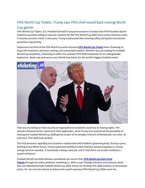 FIFA World Cup Tickets: U.S. President Donald Trump announced on Tuesday that FIFA President Gianni Infantino would be willing to relocate matches for the FIFA World Cup 2026 from certain American cities if security concerns made it necessary. Trump emphasized that ensuring safety during the tournament would be a top priority. Experience the thrill of the FIFA World Cup with exclusive FIFA World Cup Tickets from eTicketing.co. Enjoy VIP treatment, premium seating, and unmatched comfort. Whether you are looking for Football World Cup Hospitality, eTicketing.co offers the ultimate FIFA 2026 hospitality for an unforgettable experience. Book now and secure your World Cup tickets for the world’s biggest football event! Football World Cup Tickets| FIFA 2026 Tickets | FIFA World Cup 2026 Tickets That any city failing to meet security or organizational standards could lose its hosting rights. The remarks followed earlier statements from September, when Trump first mentioned the possibility of moving the Football World Cup 2026 games as part of his broader criticism of Democratic-run cities. At that time, FIFA 2026 had clarified. The final decisions regarding host locations rested solely with football’s governing body. During a press briefing at the White House, Trump expressed confidence that Infantino would cooperate if a venue change became essential. If somebody is doing a bad job, and if I feel there are unsafe conditions, I would call Gianni. Football World Cup 2026 followers worldwide can secure their FIFA World Cup Semi Final Tickets through our online platform, eticketing.co. With a user-friendly interface and exclusive deals, fans can effortlessly book Football World Cup 2026 Tickets for thrilling FIFA 2026 matches at discounted prices. Do not miss the chance to witness the world’s greatest FIFA World Cup 2026 event live. Trump and Infantino Strengthen Ties Ahead of Historic FIFA 2026 The head of FIFA World Cup 2026, who’s phenomenal, and I would say, let’s move it to another location. And he would do that, Trump said. He added that such a decision could be made very easily, underscoring his belief that FIFA 2026 would prioritize security above all else. The comment was made in response to a question. At Xchangetickets, football fans can securely buy or sell Football World Cup Tickets with ease, whether it’s Soccer World Cup Tickets, FIFA 2026 Tickets, or the highly sought-after FIFA World Cup Final Tickets. Our platform connects you with genuine fans worldwide, offering a wide range of options, Football World Cup 2026 Tickets, and general Football World Cup Tickets. With our safe and reliable marketplace, you can list your tickets for sale or grab your dream seats at the click of a button, making it simple to experience the thrill of live football from the exciting group stage clashes to the grand finale. FIFA World Cup Tickets| FIFA 2026 Tickets | Football World Cup 2026 Tickets Trump’s statements came just a day after he met with Infantino in Egypt, where the two attended a summit focused on achieving a ceasefire in Gaza. The summit brought together over two dozen world leaders to discuss ongoing efforts for peace in the Middle East. Football fans around the world are counting down to the FIFA World Cup. The ultimate celebration of sporting excellence and global passion. Take your experience to the next level with exclusive USA FIFA World Cup Tickets, available now at eTicketing.co. Immerse yourself in the thrill, drama, and unforgettable moments as they unfold live, right at the heart of the action. Don’t miss your chance to witness football’s most iconic spectacle. Secure your FIFA 2026 Hospitality packages today! Football World Cup 2026 Tickets: Trump Confident in America’s Hosting Capabilities Trump described Infantino as both a friend and an effective global sports leader. The U.S. president also mentioned that the same approach could apply to the 2028 Olympic Games in Los Angeles. I could say the same thing for the Olympics, he stated. If I thought LA was not going to be prepared properly, I would move it to another location. Passionate football fans worldwide are counting down to the FIFA World Cup Final. The ultimate stage in global football. For a chance to witness the action live, grab your FIFA World Cup Final Tickets now at eTicketing.co. This is more than a match; it’s a once-in-a-lifetime experience you won’t want to miss. Secure your place in history today! Book FIFA 2026 Hospitality Now. This remark reflected Trump’s broader stance that international sporting events held in the United States must meet high standards of safety, organization, and readiness, regardless of political affiliations or local governance issues. Throughout his presidency, Trump has frequently criticized the management of several Democratic-led cities. Click to read more on FIFA World Cup 2026. Trump and FIFA’s Infantino Unite for a Safe and Spectacular World Cup They claim they have struggled with rising crime rates and public unrest. His administration has, at times, deployed National Guard troops to some of these cities, often over the objections of state and local officials. The justification given for such actions has been the need to restore order and ensure the safety of residents and visitors. World Cup Tickets | FIFA 2026 Tickets | FIFA World Cup Final Tickets Which Trump linked to the potential risks of hosting major global events like the World Cup? Boston, one of the cities Trump mentioned specifically, is set to host seven matches during the Football World Cup 2026. Other major cities involved include San Francisco and Seattle, which are each scheduled to host six matches. Los Angeles will stage eight games, making it one of the tournament’s most active venues. The USA FIFA World Cup marks a historic expansion of the tournament, featuring 48 teams instead of the traditional 32. The United States will co-host the event alongside Mexico and Canada, though