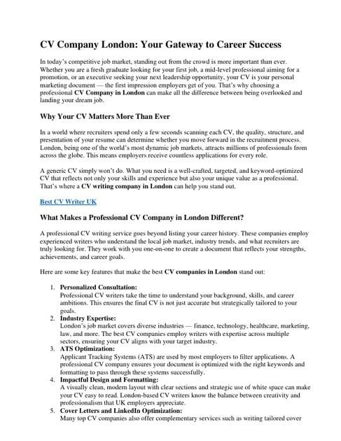 Whether you are a fresh graduate looking for your first job, a mid-level professional aiming for a promotion, or an executive seeking your next leadership opportunity, your CV is your personal marketing document — the first impression employers get of you. That’s why choosing a professional CV Company in London can make all the difference between being overlooked and landing your dream job.
