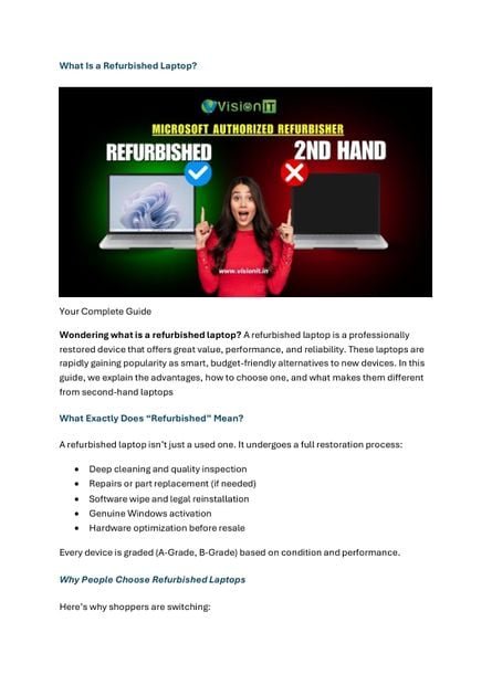 Refurbished laptops provide a budget-friendly, high-quality computing solution for students, professionals, and businesses. Professionally restored, rigorously tested, and backed by warranties, these laptops combine performance and reliability. Learn why buying from a Microsoft Authorized Refurbisher like Vision IT Peripherals ensures genuine software and peace of mind.Read the full guide here